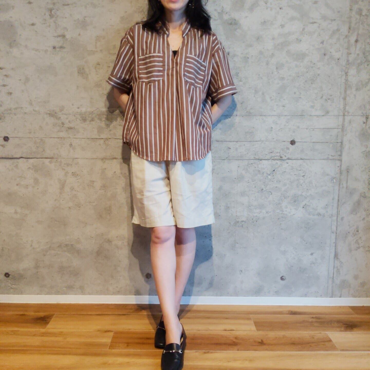 ドロップショルダーのやや大きめサイズのシャツなので、抜け感のあるリラックスムードな着こなしが出来ます。